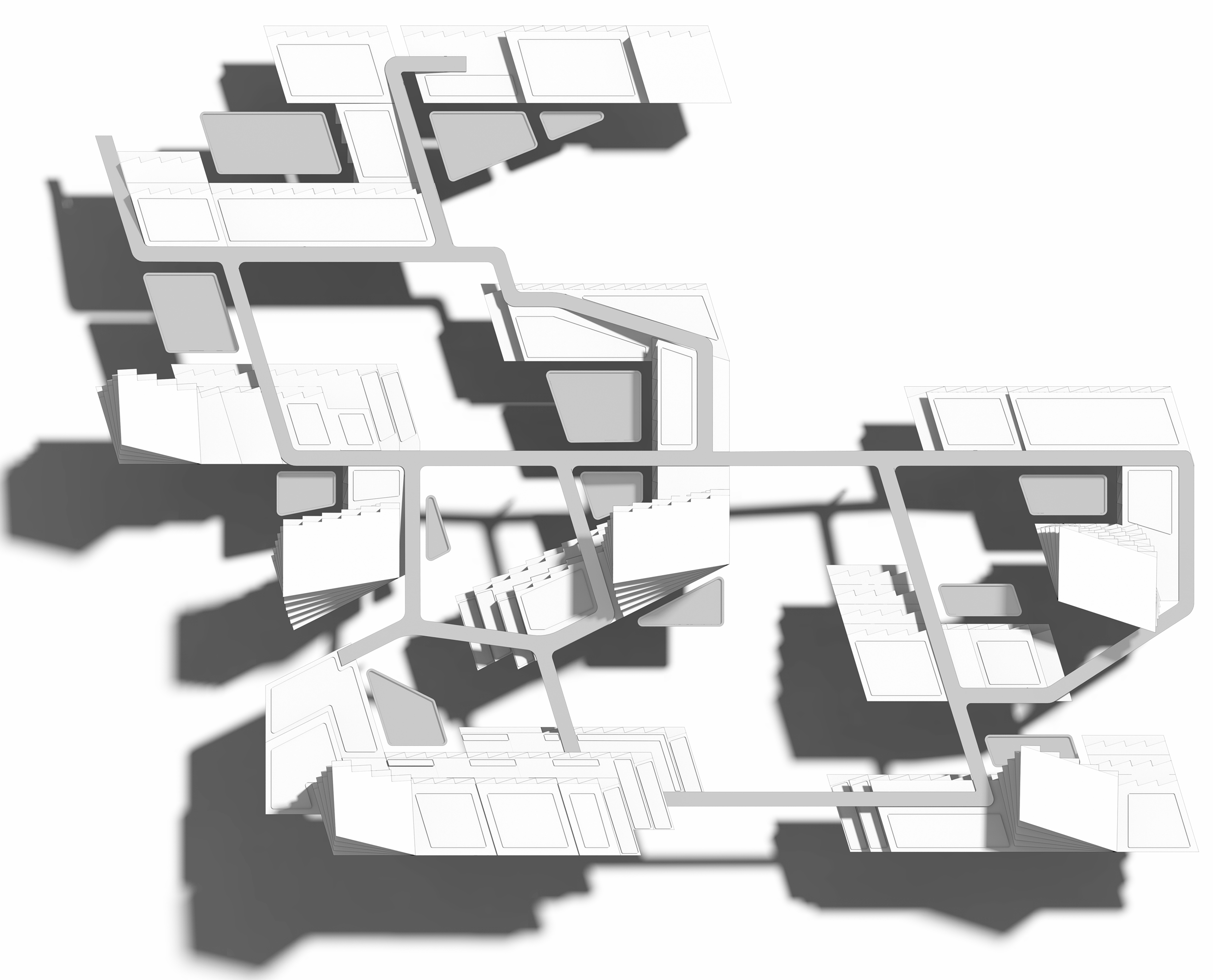 “My master plan is a series of terraced single bedroom apartments ranging from high to medium in density. The plan utilizes prefabricated construction to position a lattice of single bedroom units across the pre-existing terrain. The layout aims to promote interconnectivity through a series of bridges and pathways to create a communally accessible space helping to promote a sense of community and belonging. The units are all designed to incorporate passive heating and universal design.”